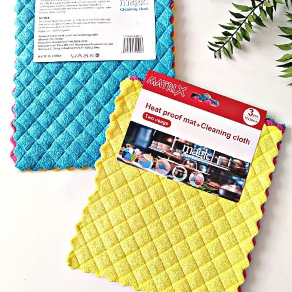 این دستمالها معمولاً در ابعاد ۴۰×۴۰ سانتیمتر تولید میشوند و بافت حولهای آنها باعث میشود بدون نیاز به مواد شوینده، سطوحی مانند اجاق گاز، کابینت، یخچال، شیشه و ظروف را بهراحتی تمیز کنند.