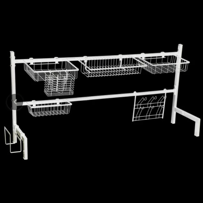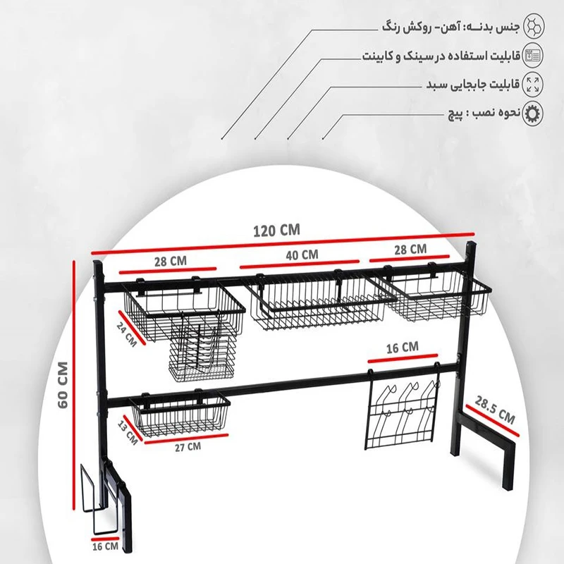 این مدل با بدنه استیل ضدزنگ، پایههای ضدلغزش و تفکیک بخشهای مختلف ظروف، نظم و کارایی بالایی را در فضای بالای سینک فراهم میکند.