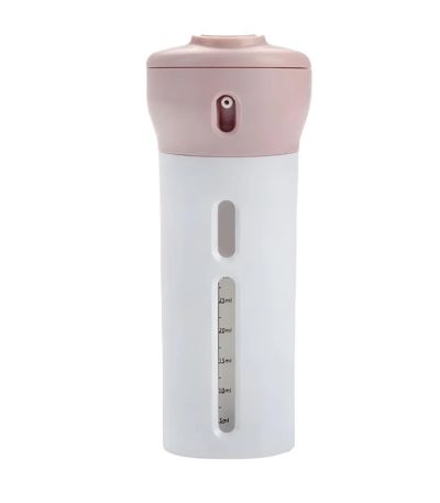 این محصول شامل دو بطری پمپی با طراحی استوانهای و رنگهای ملایم صورتی و طوسی است که هرکدام دارای چهار مخزن داخلی با ظرفیت ۴۰ میلیلیتر هستند.