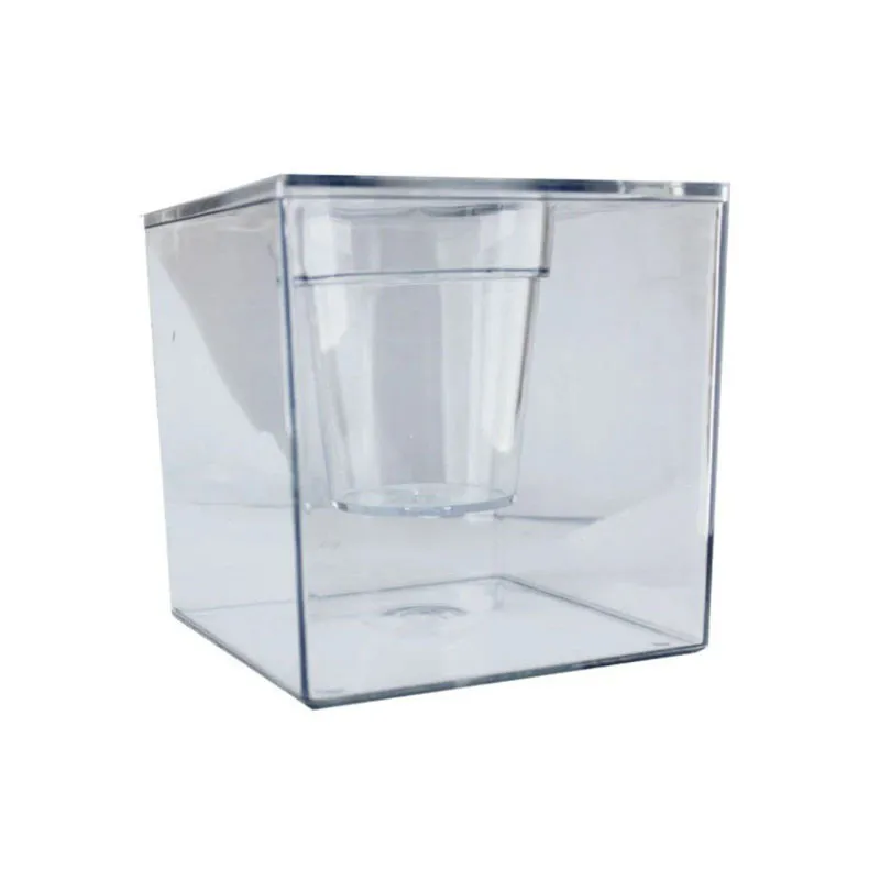 جنس این محصول اکرولیک بوده و این گلدان ها شفاف بوده و به طور همزمان میتوان بخش داخل خاک گلدان را دید و از خشک بودن خاک اطلاع پیدا کرد و همچنین می توان ماهی های داخل آکواریوم را مشاهده کرد.